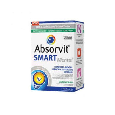 Absorvit Smart Mental Cápsulas é um suplemento alimentar especialmente concebido para quem sofre de confusão mental, memória e atividade cerebral. Formulado com vitamina B5 (ácido pantoténico) contribui para um desempenho mental normal. A vitamina B6 e o ácido fólico contribuem para uma normal função psicológica, Vitaminas B2 e E contribuem para a proteção das células contra as oxidações indesejáveis e Vitaminas B6 e B12 contribuem para a redução do cansaço e da fadiga e para o normal metabolismo produtor de energia.