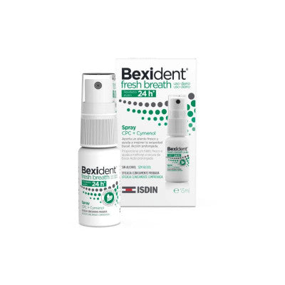 ISDIN Bexident Fresh Breath Spray 15ml recomendado para higiene oral diária em caso de ausência de hálito fresco, secura da boca e/ou mau hálito (halitose).
