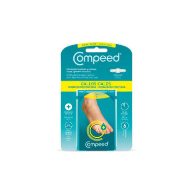 Compeed Pensos Calos Hidratação é um penso que alivia a dor e protege contra a fricção e pressão, indicado na remoção de calos, de forma rápida e natural. A tecnologia hidrocoloide Compeed® ajuda a reduzir a pressão e alivia imediatamente a dor. Melhora também a hidratação da pele, suavizando o calo, facilitando a sua remoção. Material impermeável e respirável. Adapta-se a todos os movimentos e não se descola durante dias. Quantidade: 6 pensos.