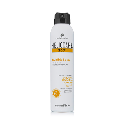 O spray Heliocare 360º Invisible SPF50+ oferece proteção invisível e refrescante, com rápida absorção, sendo aplicável também na pele molhada.