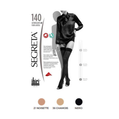 Ibici Segreta Stay Up 140 AF T4 Cor 36 Chamois é uma meia até à raiz da coxa de suporte médio-forte com biqueira aberta, textura de favo de mel transparente e banda de silicone autoaderente analérgico suave.- Perfeita para as veias capilares dilatadas e para veias varicosas, inclusive durante a gravidez.