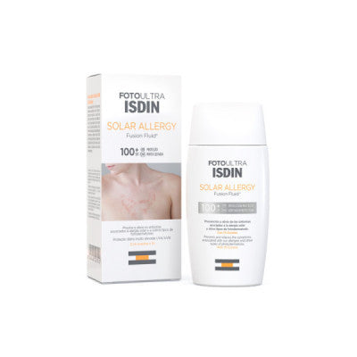Isdin FotoUltra Solar Allergy Fusion Fluid FPS100+ é um protetor solar que previne e alivia os sintomas associados à alergia solar ou outros tipos de fotodermatoses.Benefícios:- Alivia os sintomas associados à alergia solar, como o prurido e a inflamação, e protege contra a luz visível;- Proporciona uma proteção 2 vezes superior ao mínimo requerido num protetor solar FPS50+ contra a radiação UVA;- Contém 1% de Ectoína, que proporciona um efeito hardening à pele, tornando-a mais resistente contra as agressões da radiação UV;- Ideal em casos de erupção polimórfica lumínica e reações fotoalérgicas induzidas por fármacos.