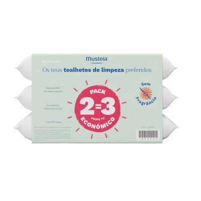 Mustela Bebé Toalhetes de Limpeza Sem Perfume Pack 3 é um pack promocional de 2=3 de toalhetes.