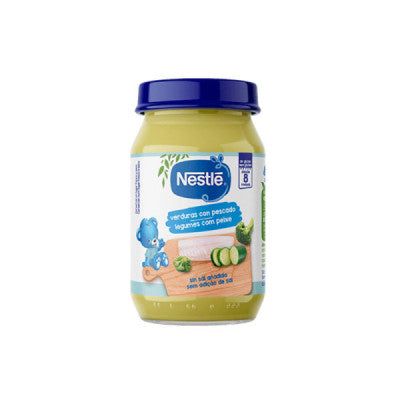 Nestlé Boião Legumes Com Peixe é uma refeição pronta a comer para bebés a partir dos 8 meses. Enriquecida com Água de Cozedura, Batata (20%), Pastinaga, Esacmudo do Alasca (12%), Curgete (9%), Brócolos (6%), Sêmola de Arroz e Óleo de Semente de Nabo. Sem glúten. Depois de aberto pode conservar no frigorífico até 48 horas. Sirva à temperatura ambiente ou aqueça em banho-maria ou no micro-ondas. Não adicione sal.