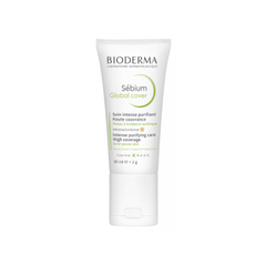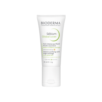 Bioderma Sébium Global Cover proporciona uma cobertura de longa duração que elimina borbulhas e pontos negros, regula o brilho e neutraliza a vermelhidão, oferecendo 12h de efeito matte e tratamento eficaz para pele com tendência acneica.